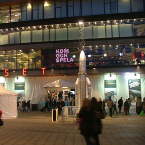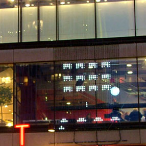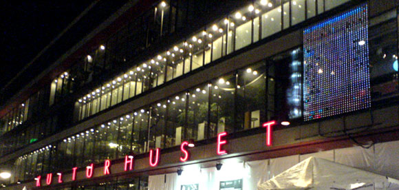 Ovanför entrén till utställningen "Rymdbas Stockholm" på Kulturhuset i centrala Stockholm sitter nu en installation av vår unika led-skärm "SpookLed". På den visas info om utställningen.